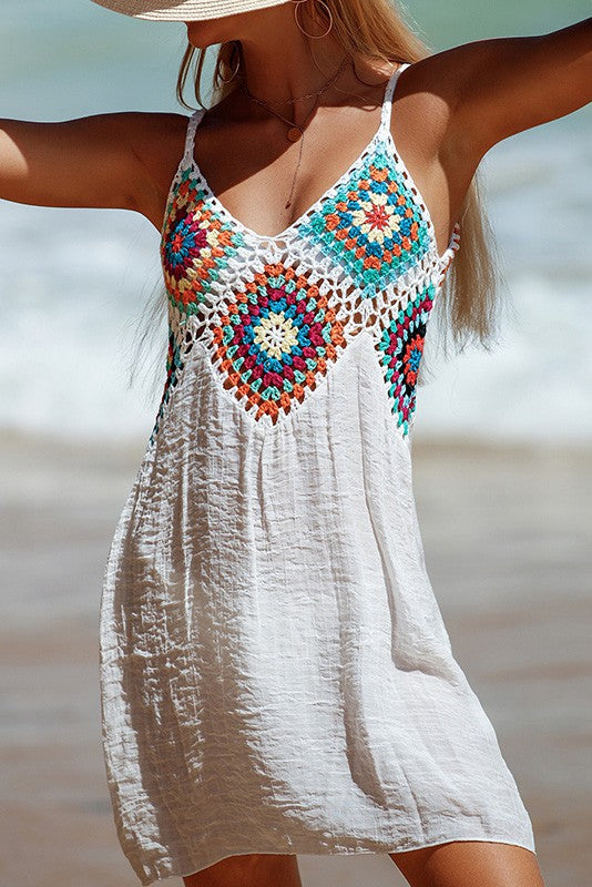 Meet your everywhere summer dress. The Babe mini dress is designed in white with a relaxed fit & bright multi colored crochet details with adjustable straps. Grab it and go from the beach to the party.